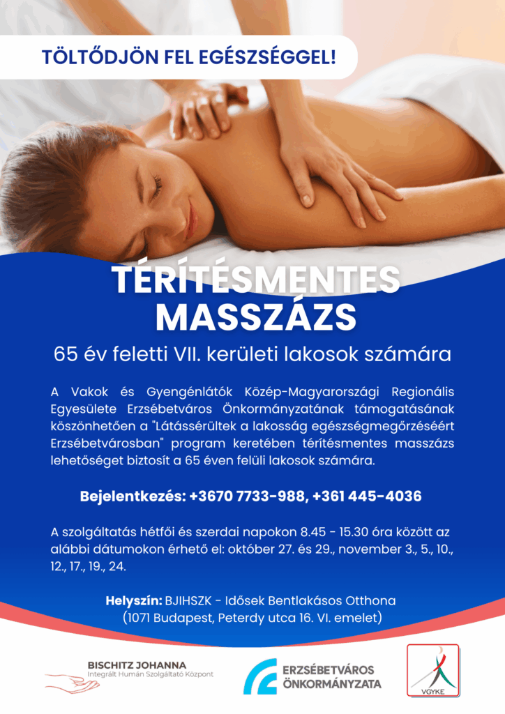 A Vakok és Gyengénlátók Közép-Magyarországi Regionális Egyesülete Erzsébetváros Önkormányzatának támogatásának köszönhetően a „Látássérültek a lakosság egészségmegőrzéséért Erzsébetvárosban” program keretében térítésmentes masszázs lehetőséget biztosít a 65 éven felüli kerületi lakosok számára.