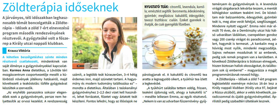 A Zöldterápia – Idősek a zöld 7-ért program legközelebbi eseménye március 16-án lesz a Király nappali klubban (Király utca 97, bejárat a Rózsa utcából), akkor a vetés következik, paradicsommal és újabb gyógynövényekkel. Áprilistól pedig szabadtéri ültetések lesznek.